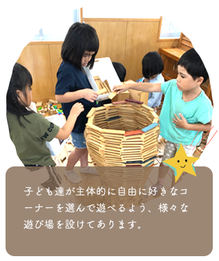 子ども達が主体的に自由に好きなコーナーを選んで遊べるよう、様々な遊び場を設けてあります。