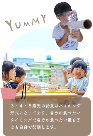 3・4・5歳児の給食はバイキング形式になっており、自分の食べたいタイミングで自分の食べたい量を子ども自身で配膳します。